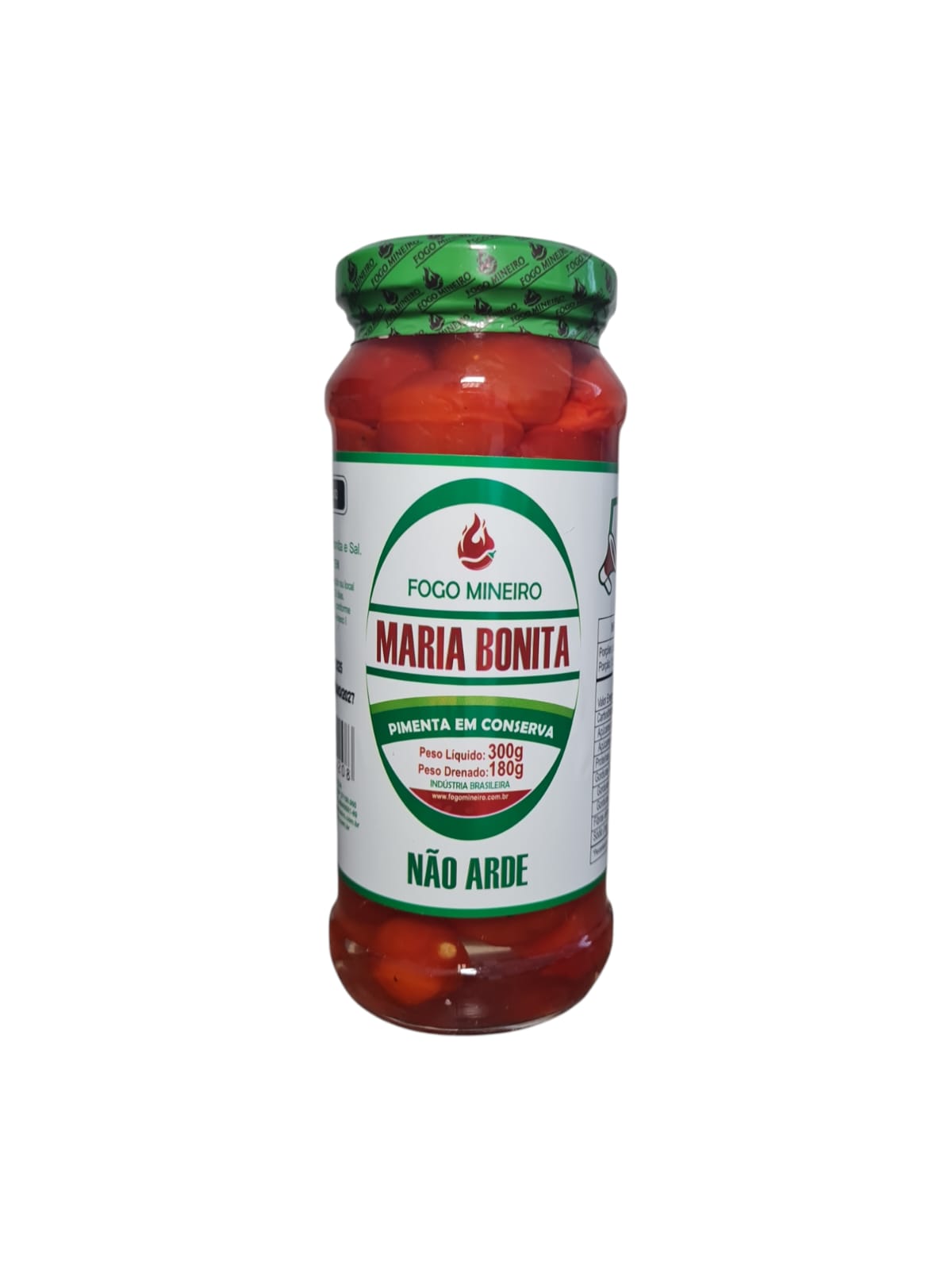 Pimenta Maria Bonita inteira em conserva 300g. Ingredientes: pimenta maria bonita, vinagre e sal. A pimenta Maria Bonita é uma variedade da pimenta biquinho, com paladar levemente adocicado, é uma excelente opção para quem tem sensibilidade ao ardor mais intenso de outras pimentas. O nome surgiu para homenagear as mulheres do Brasil. |